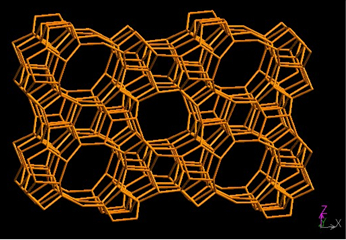 ZSM是Zeolites Socony Mobil的縮寫,ZSM-5沸石分子篩則是20世紀(jì)七十年代美國Mobil石油公司開發(fā)成功的一系列新型的高硅鋁比沸石分子篩中其中的一種。它有著獨(dú)特的交叉孔道結(jié)構(gòu),都是10氧環(huán)組成,其直筒型孔道呈橢圓形,橫向孔道截面近似于圓形,孔口尺寸稍有區(qū)別。一組為平行于單胞的a軸,呈“Z”字形具有近似于圓形的開孔,其尺寸為0.54×0.56nm;另一組平行于單胞的b軸,為直通道,但為橢圓開口,其尺寸為0.51×0.57nm。ZSM-5晶體屬于理想的斜方晶系,其結(jié)構(gòu)參數(shù)為a=20.1,b=19.9,c=13.4。